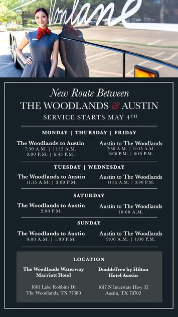 ▪ Monday — The Woodlands to/from Austin: 7:30 a.m., 11:15 a.m., 3:00 p.m., and 6:45 p.m. ▪ Tuesday — The Woodlands to/from Austin: 11:15 a.m. and 3:00 p.m. ▪ Wednesday — The Woodlands to/from Austin: 11:15 a.m. and 3:00 p.m. ▪ Thursday — The Woodlands to/from Austin: 7:30 a.m., 11:15 a.m., 3:00 p.m., and 6:45 p.m. ▪ Friday — The Woodlands to/from Austin: 7:30 a.m., 11:15 a.m., 3:00 p.m., and 6:45 p.m. ▪ Saturday — Austin to The Woodlands: 10:00 a.m.; The Woodlands to Austin: 2:00 p.m. ▪ Sunday — The Woodlands to/from Austin: 9:00 a.m. and 1:00 p.m.