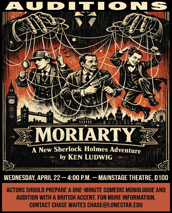 Building on the momentum of its spring production, the department will hold auditions for Moriarty, a fast-paced comedic play by Ken Ludwig that reimagines the world of Sherlock Holmes with humor, theatricality and rapid character changes.