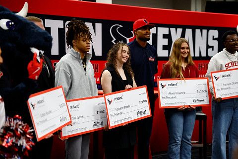 HOUSTON, TX -- Reliant and the Houston Texans celebrated the 20th anniversary of the Scholarships for Champions program by surprising six high school seniors with $10,000 scholarships. To honor the student-athletes’ incredible academic and athletic accomplishments, the students and their families were treated with a special Houston Texans experience following surprise check presentations.