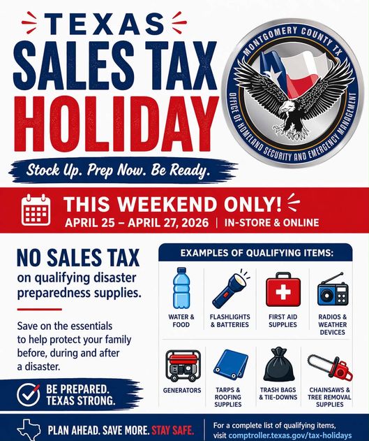 THE WOODLANDS, TX – The Texas Comptroller’s Office has announced that this weekend will be a Texas sales tax holiday for emergency preparedness supplies. The event begins at 12:01 a.m. on Saturday, April 25, and ends at midnight on Monday, April 27.