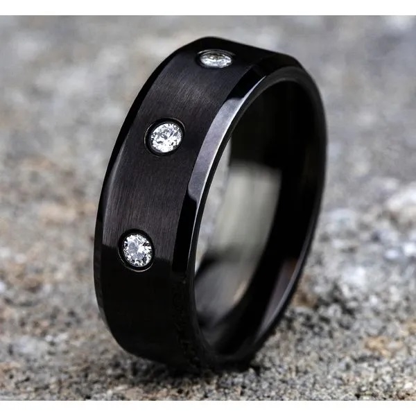 8mm, Comfort fit Black Cobalt Satin finish center, polished bevel edges 3 burnish set diamonds Carat weight is .18ct