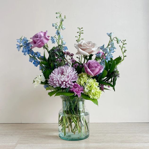 "Seine" is a spring-inspired floral arrangement that evokes the serene beauty of the Seine River. Featuring lush green hydrangeas, delicate blue delphiniums, and vibrant purple scabiosa, this arrangement captures the essence of tranquility and elegance, much like the gentle flow of the river itself. The soft green and blue hues are complemented by the rich purple tones, creating a balanced and sophisticated composition that celebrates the season's bloom. Perfect for adding a touch of grace to any space, "Seine" brings nature's peaceful charm indoors.