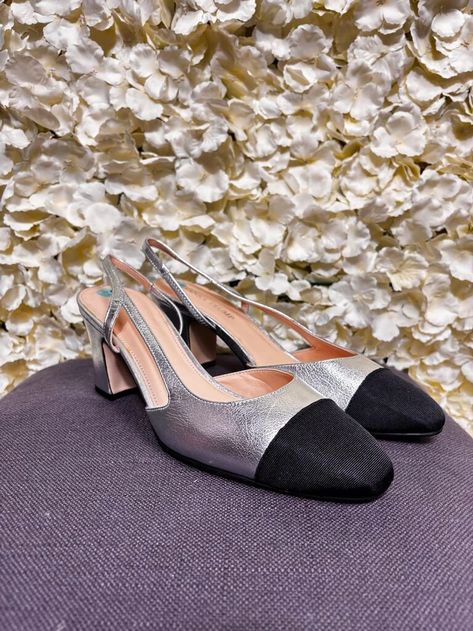 Ivanka Trump Metallic Silver Black Tip Sling Back Heels