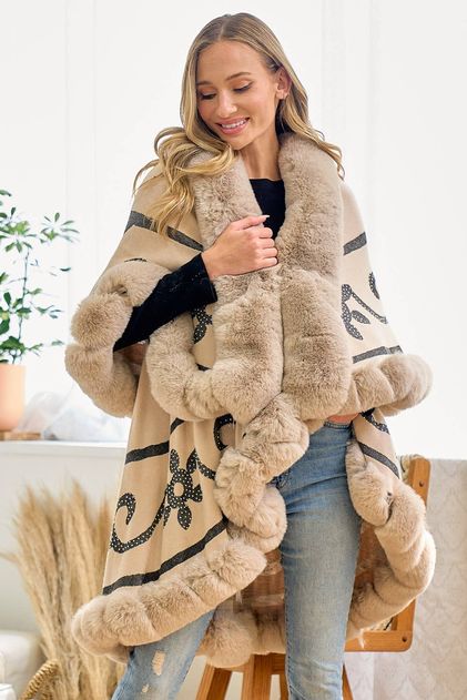 - Faux Fur Shawl Women Fine Knit Open Front Faux Fur Trim Layers Poncho Cape Cardigan Sweater Rhinestone Chain Patterned All Around the Body Hook & Eye Closure Extremely Soft with a Fuzzy Texture