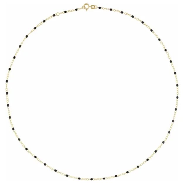 Introducing the 14K Yellow and Clear Enamel Bead Necklace, an exquisite piece that beautifully blends classic elegance with modern design. Made from solid 14-karat yellow gold, this necklace features clear enamel beads that create a light and airy feel, making it a versatile addition to any jewelry collection.