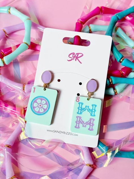Game night just got a major upgrade! These playful hand-painted mint acrylic Mahjong tile earrings feature bold blue, purple, and pink accents, topped with a chic purple oval enamel stud for an extra pop of color. Whether you're a Mahjong master or just love the aesthetic, these earrings are a stylish nod to your favorite game.