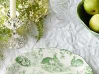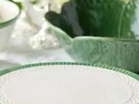 Display your desserts in timeless style with the Le Jardin Embossed Rattan Footed Cake Plate. Designed to elevate your sweets—both literally and aesthetically—this ceramic cake stand features a finely embossed rattan texture along its top rim and base, wrapped in a soft ivory glaze and finished with a striking green trim. The wide, flat surface offers the perfect stage for cakes, tarts, pies, or stacked pastries, while the footed base adds elegant lift and visibility. Whether placed at the center of a festive dessert table or used as a charming accent for casual gatherings, this piece adds architectural grace and organic flair. It’s a beautiful marriage of craftsmanship and function, inviting admiration with every slice served. This cake plate complements traditional, farmhouse, and garden-inspired tablescapes with ease, making it a versatile and heirloom-worthy addition to your collection.