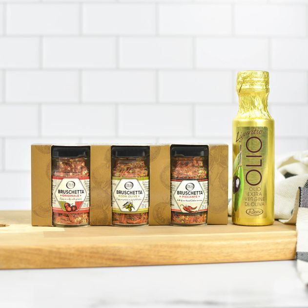 Indulge in a variety of delicious bruschetta flavors paired with the smooth richness of our Liguritio EVOO. Whether you're hosting a gathering or looking for a thoughtful gift, this set promises to impress with its gourmet selection and festive charm.