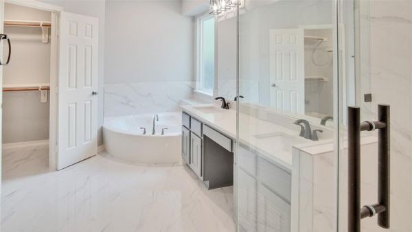 Upstairs, the teen suite includes a large bedroom with a custom closet system, a private shower/tub bath, and an adjoining den-perfect for relaxation or study. The primary bathroom has been fully renovated with quartz counters, his-and-hers closets, and a seamless glass shower for a spa-like retreat.