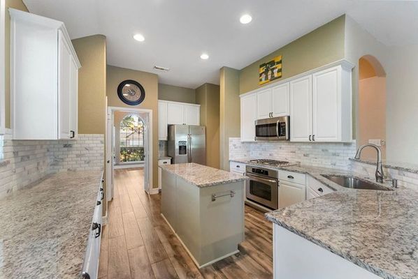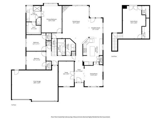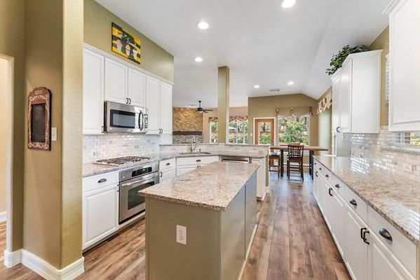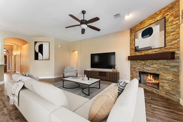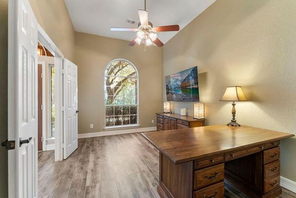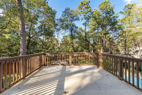 Stunning traditional brick home with exceptional curb appeal on an oversized cul-de-sac lot! Enter a light-filled interior with wood-look tile flooring, soaring ceilings, and elegant architectural details. A private study and spacious formal dining room sit just off the entry. The expansive family room opens to the breakfast area and the island kitchen featuring GE Profile appliances and white cabinetry with granite countertops. The serene primary suite features a remodeled ensuite bath with marble flooring, an oversized glass-enclosed shower, and a generous walk-in closet. Two secondary bedrooms are thoughtfully arranged in a split floor plan with access to a full hall bath. Upstairs, enjoy a bonus game room and a large balcony overlooking the sparkling pool and spa. The private backyard oasis features lush landscaping, expansive decking, two covered patios, and ample green space, offering the perfect blend of comfort and style. A rare three-car garage offers excellent convenience!