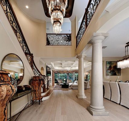 This stunning estate, situated on two adjoining lots, has been extensively updated between 2022–2025 and is truly one of a kind. Located in the prestigious, manned-gated community of Carlton Woods Nicklaus within the coveted Kingscote enclave, this home offers elegance, privacy, and exceptional space for entertaining. A gated drive leads to an impressive 1,272 sq ft carriage house with room for up to five vehicles. This versatile space is elevator-capable and large enough to accommodate a boat or RV. It also includes a kitchenette and full bath, making it ideal as a guest residence, private office, or additional living quarters. Enjoy the outdoor covered veranda complete with a stone fireplace. The property also features a private casita, enhancing its flexibility and appeal. Inside the main home, the fully renovated kitchen showcases top-of-the-line stainless steel appliances and exquisite quartzite countertops. Soaring ceilings and expansive windows fill the home with natural light. Outdoor living is exceptional, with a covered lanai featuring a built-in grill, plus a covered cabana with a fireplace overlooking the sparkling pool and spa—perfect for year-round entertaining. The luxurious owner’s retreat offers a spa-inspired bath with timeless marble countertops and two spacious closets, including an impressive 25x12 walk-in. A playroom is conveniently located on the main level. Upstairs, you’ll find two generously sized bedrooms along with game and media rooms. Additional upgrades include five replaced HVAC systems, updated lighting, solar blinds, a generator, and two EV charging stations.